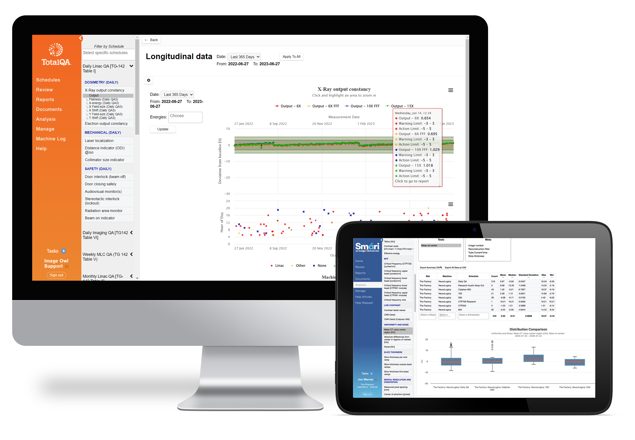 “TotalQA, the industry’s leading solution, is designed to elevate your radiotherapy QA. Our versatile system adapts to your requirements, while our unwavering client support ensures a successful clinical integration. Together, we co-create your custom machine QA system, actively incorporating your valuable feedback.”